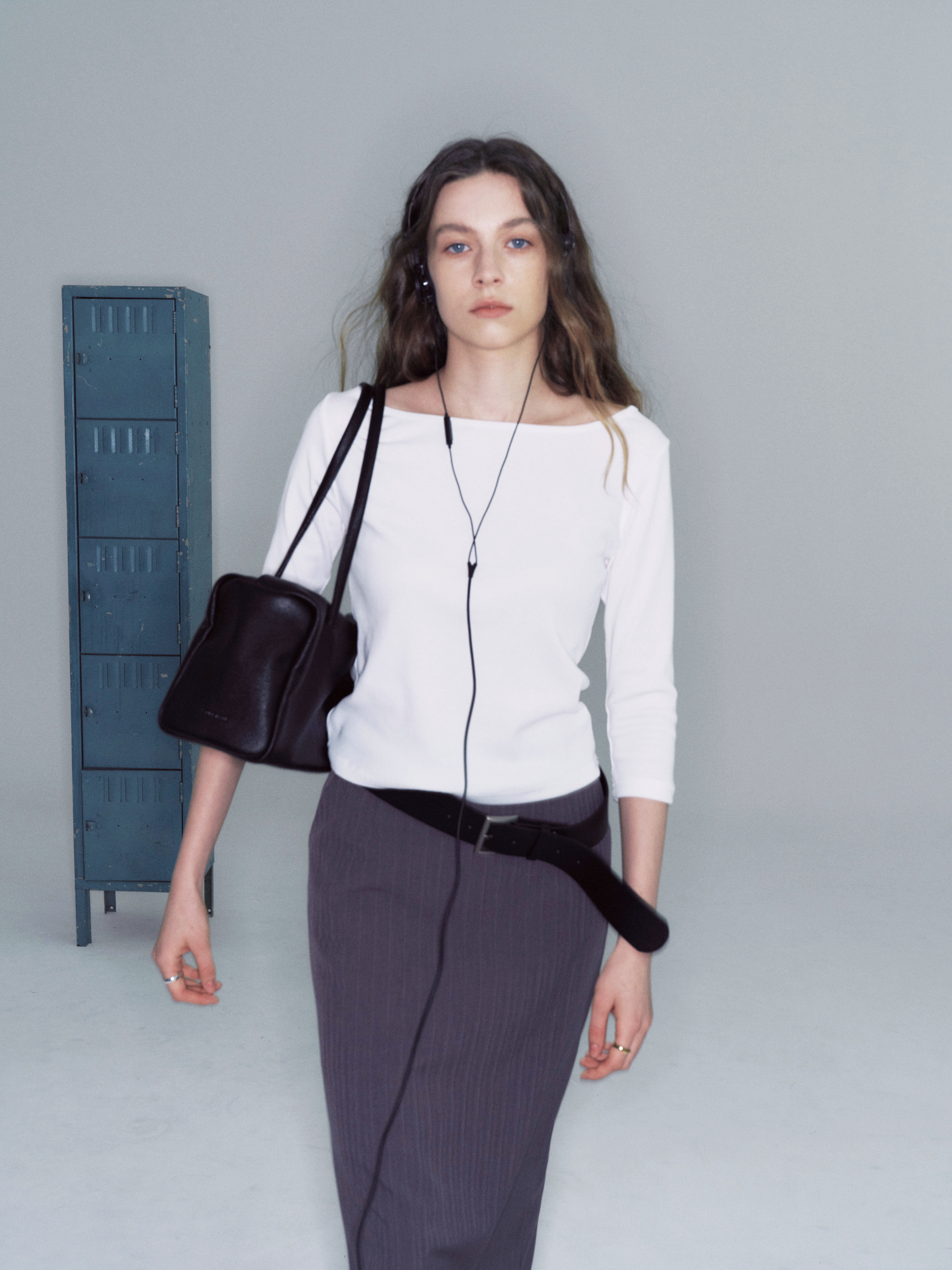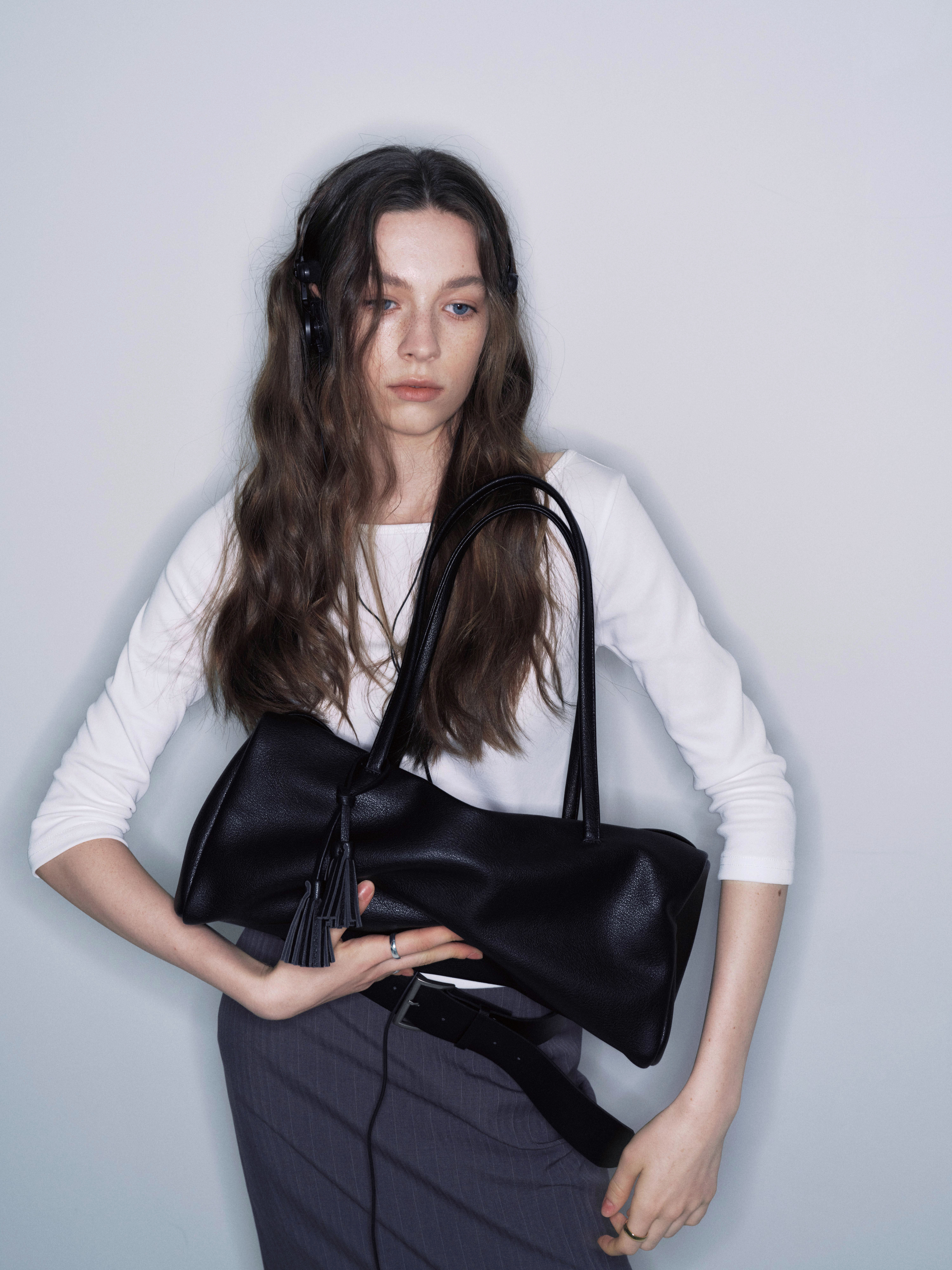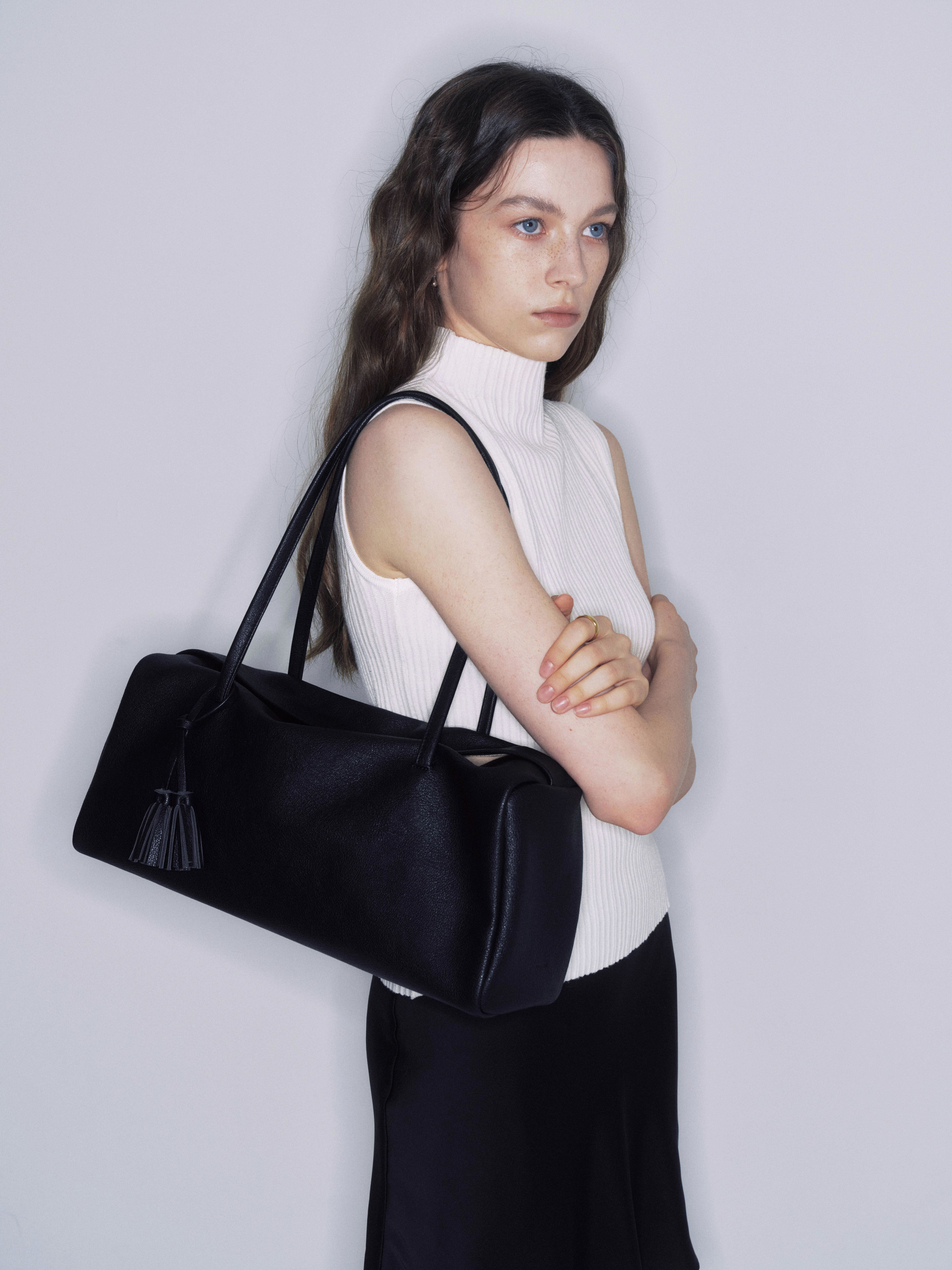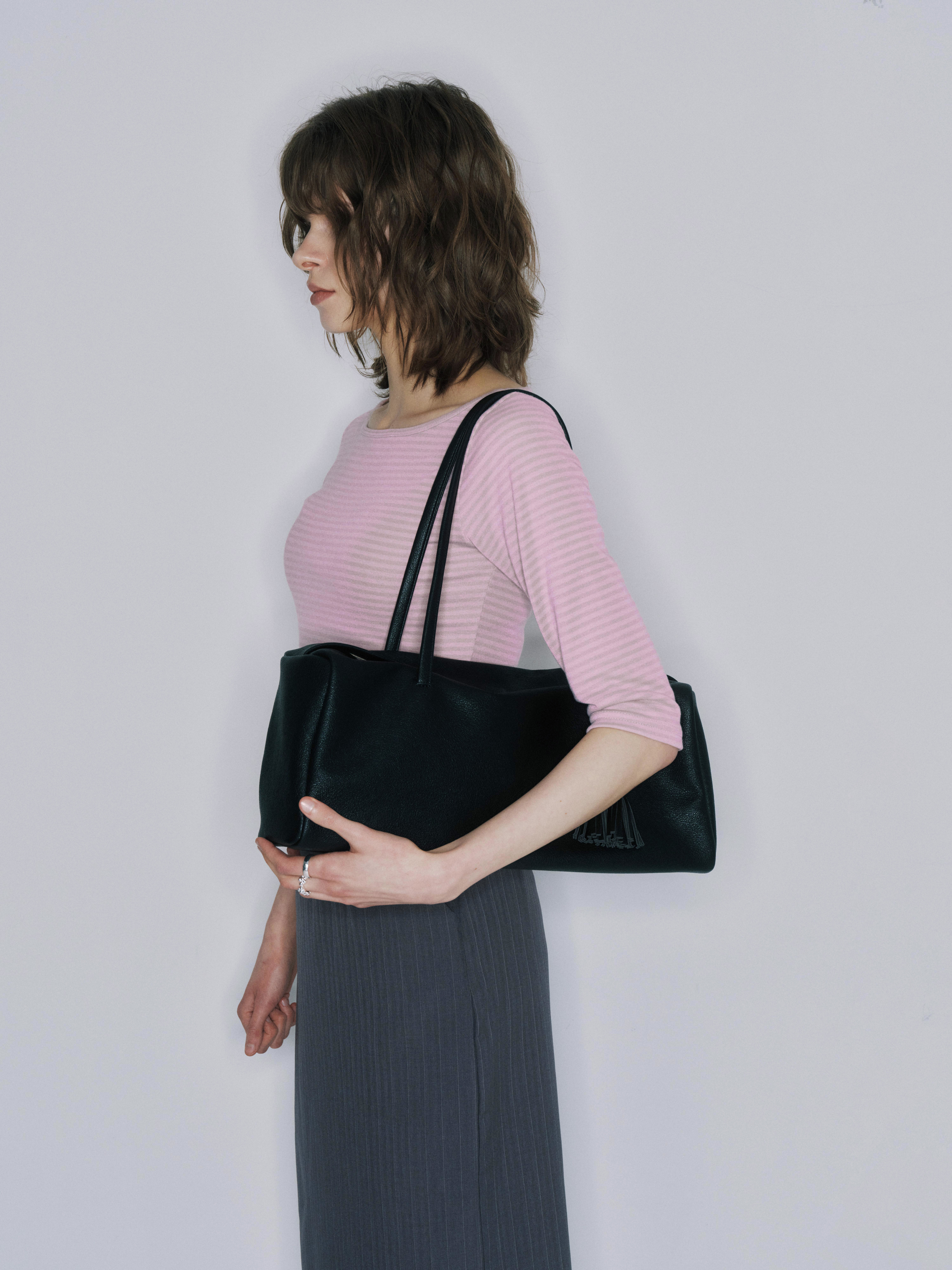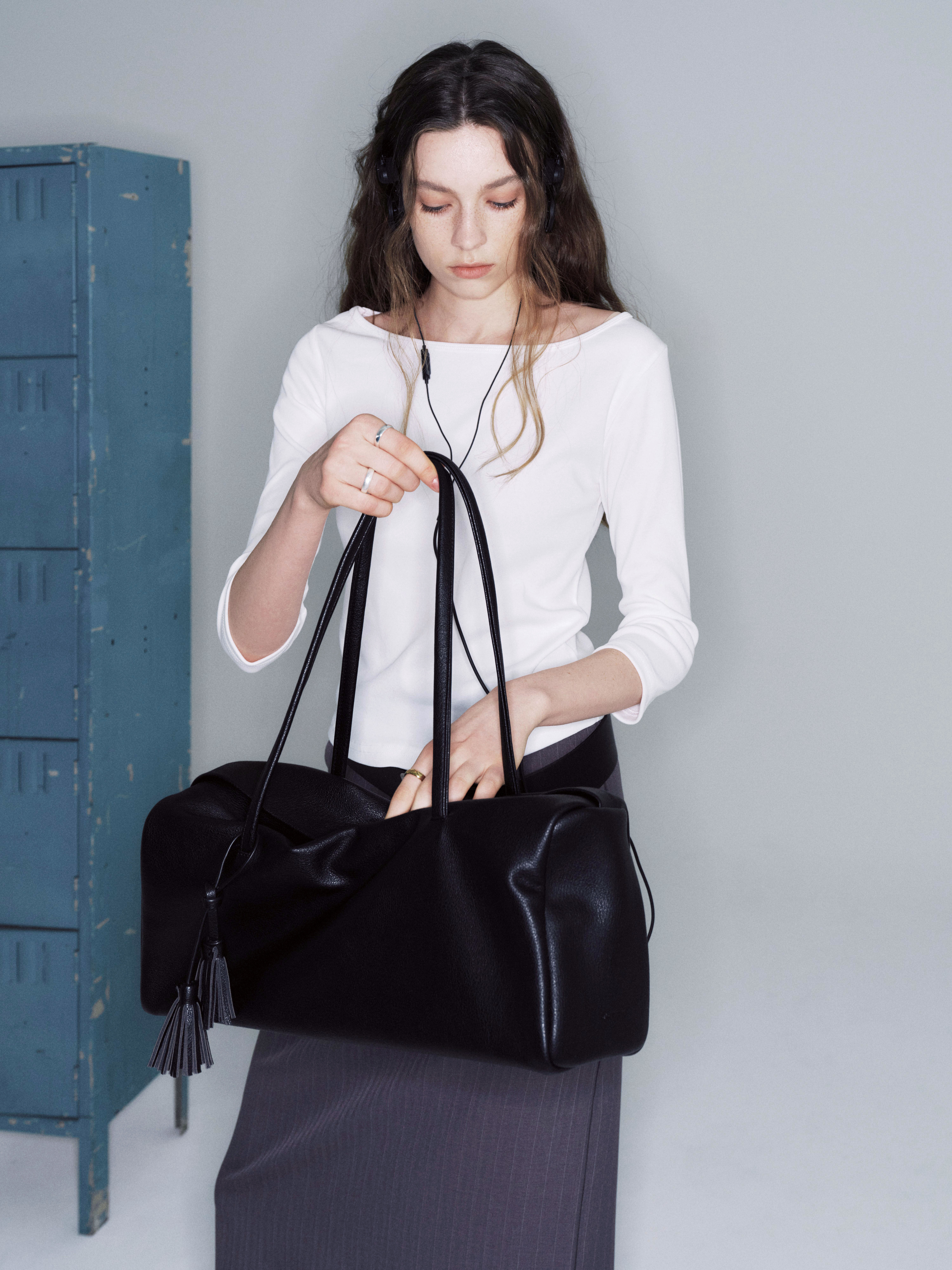 しなやかに落ちるボディと長めのハンドルは肩に自然になじみ、