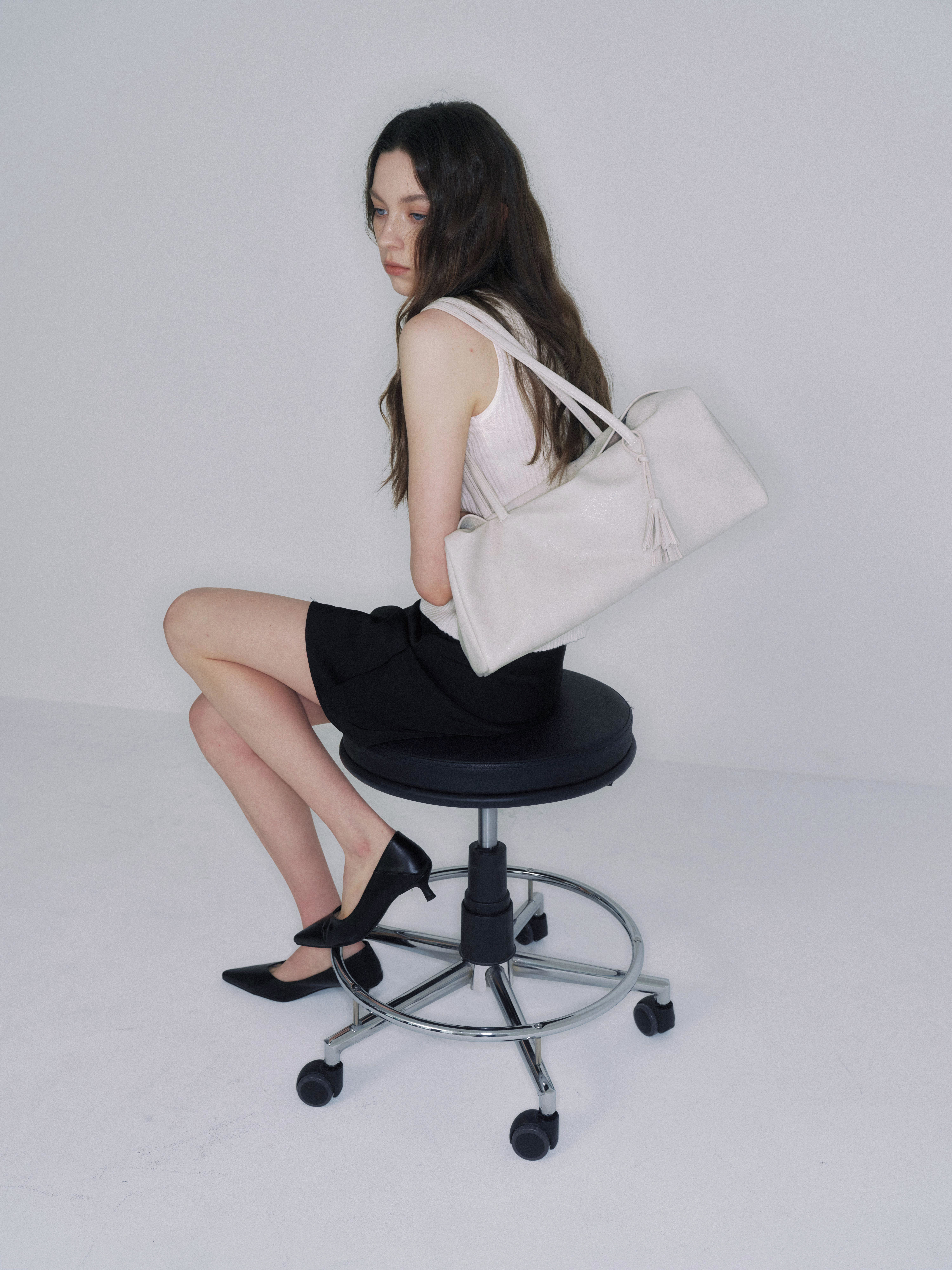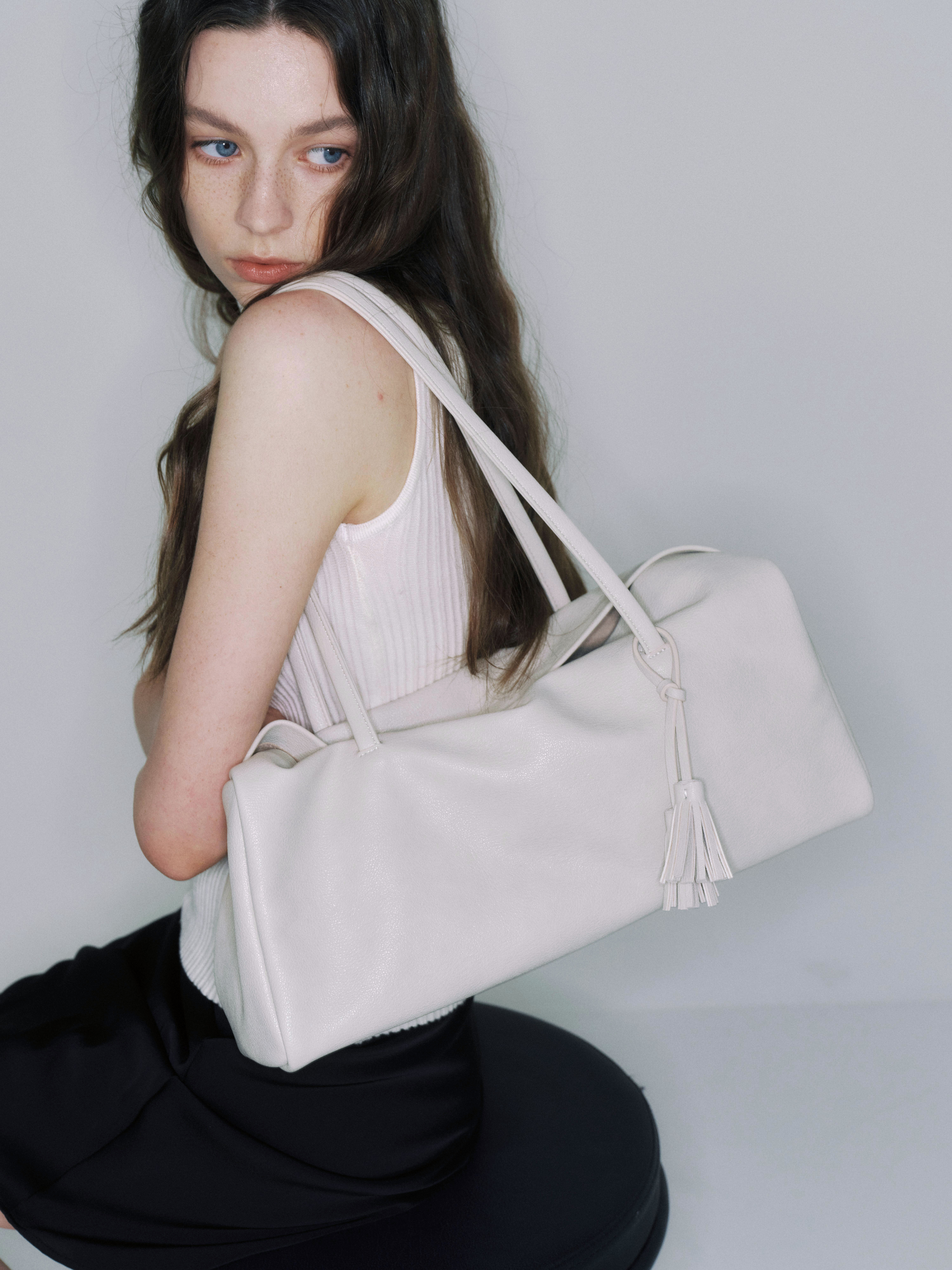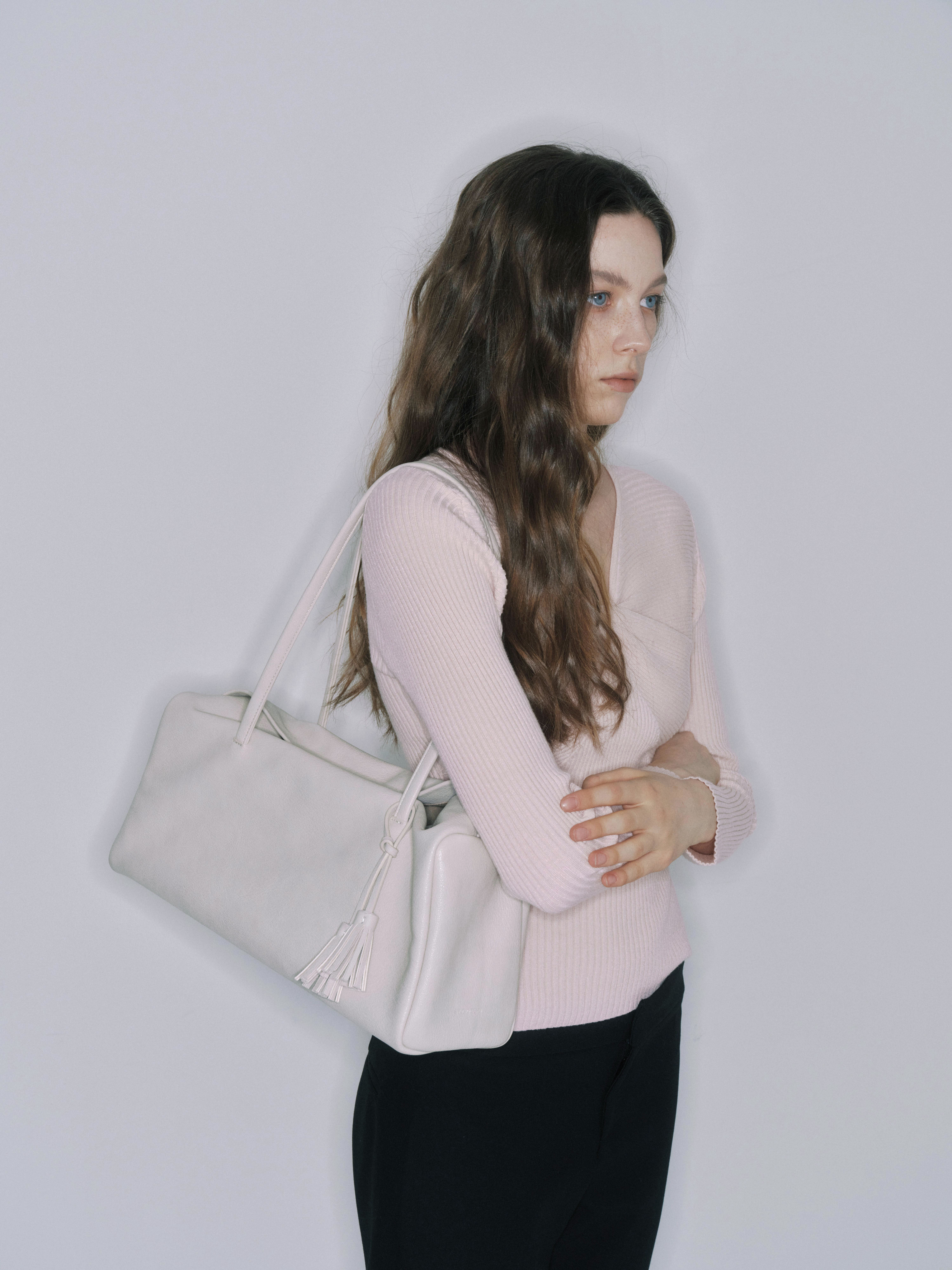 バッグのサイドに施されたタッセルディテールが、シンプルなデザインにさりげないアクセントを添えます。